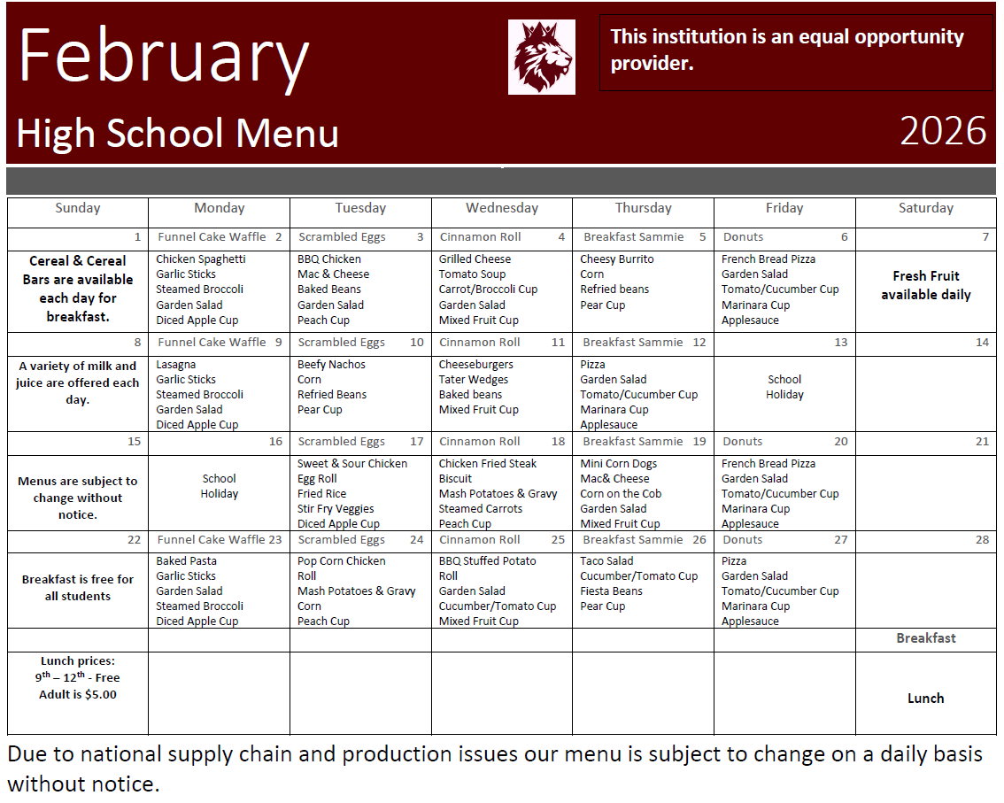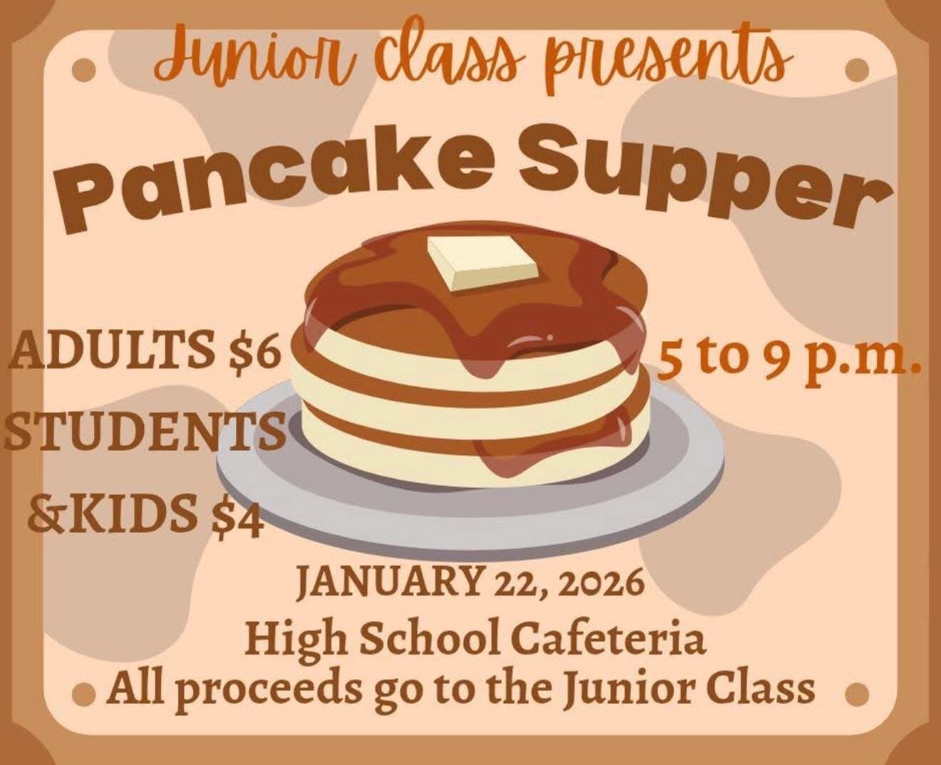 HOMECOMING INFORMATION!On January 22nd, we will have the following events!Pancake supper:Serving from 5:00 PM - 9:00 PMAdults $6Students/kids $4Location: High School CafeteriaAll proceeds support t...