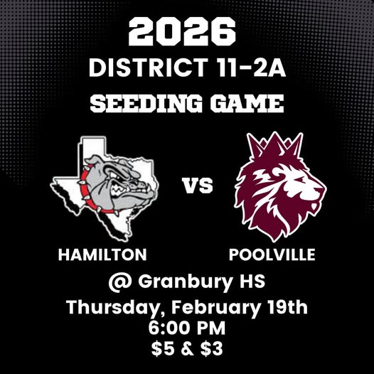 Boys BasketballBasketball Playoff Tie Breaker Game, Poolville v Hamilton at Granbury HSGates Open @ 5:15pmGame Starts @6:00pmPasses Accepted:TABCTHSCADistrict 11Senior PassesJames Wann Sports Cente...